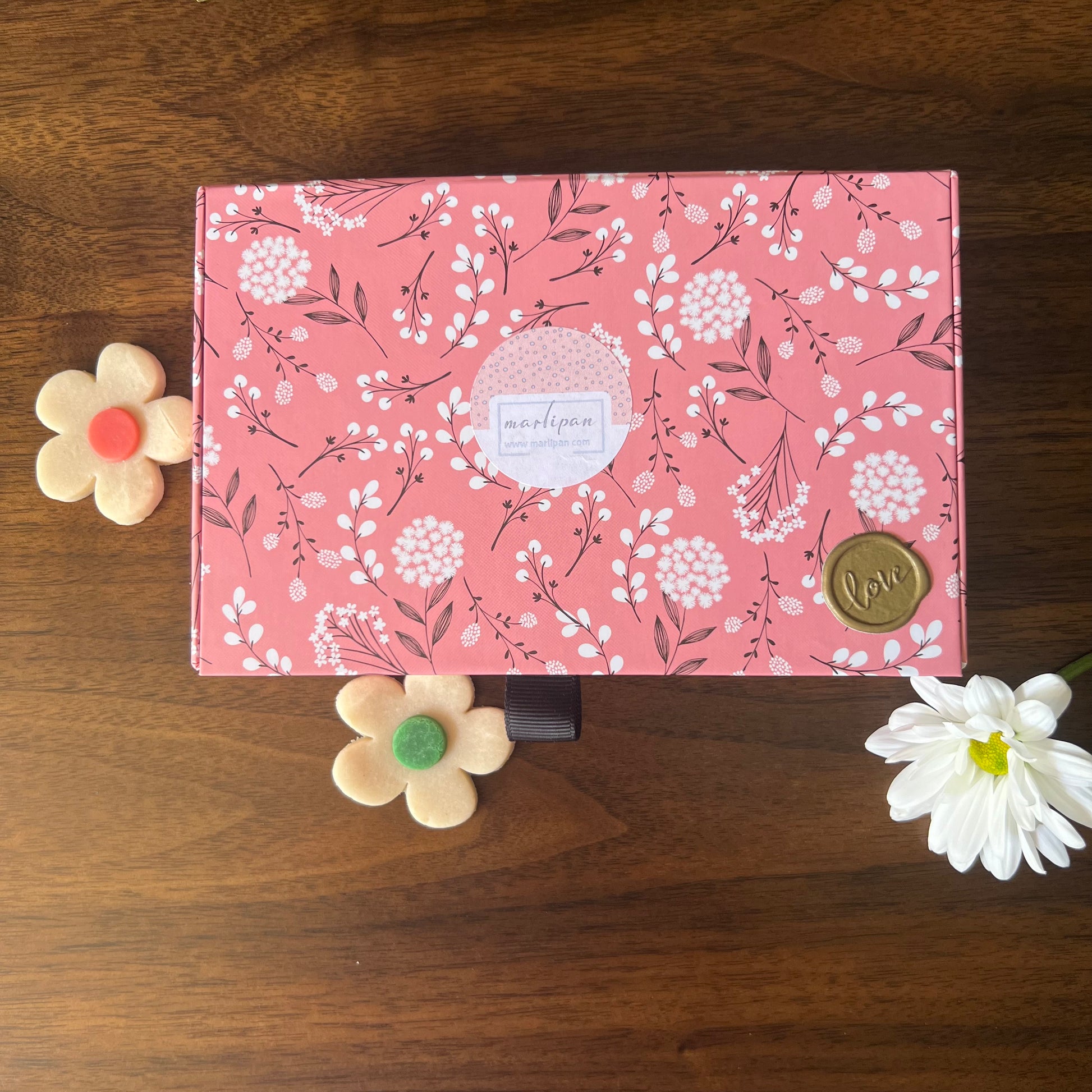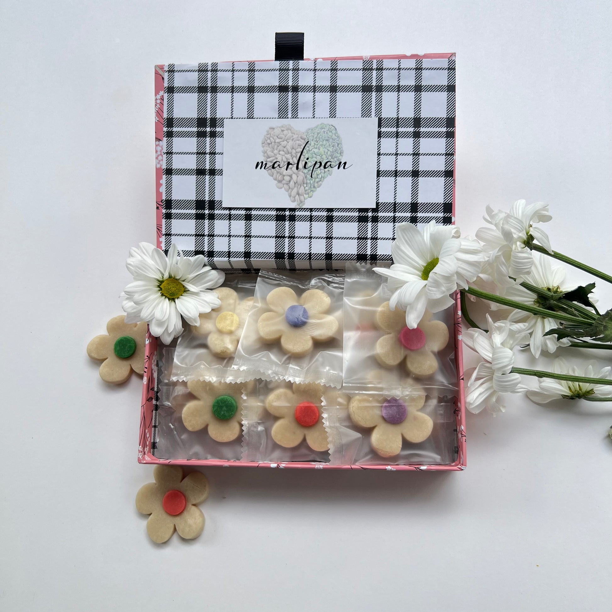 Premium quality of almonds, orange blossom water, powdered sugar. Some food coloring.