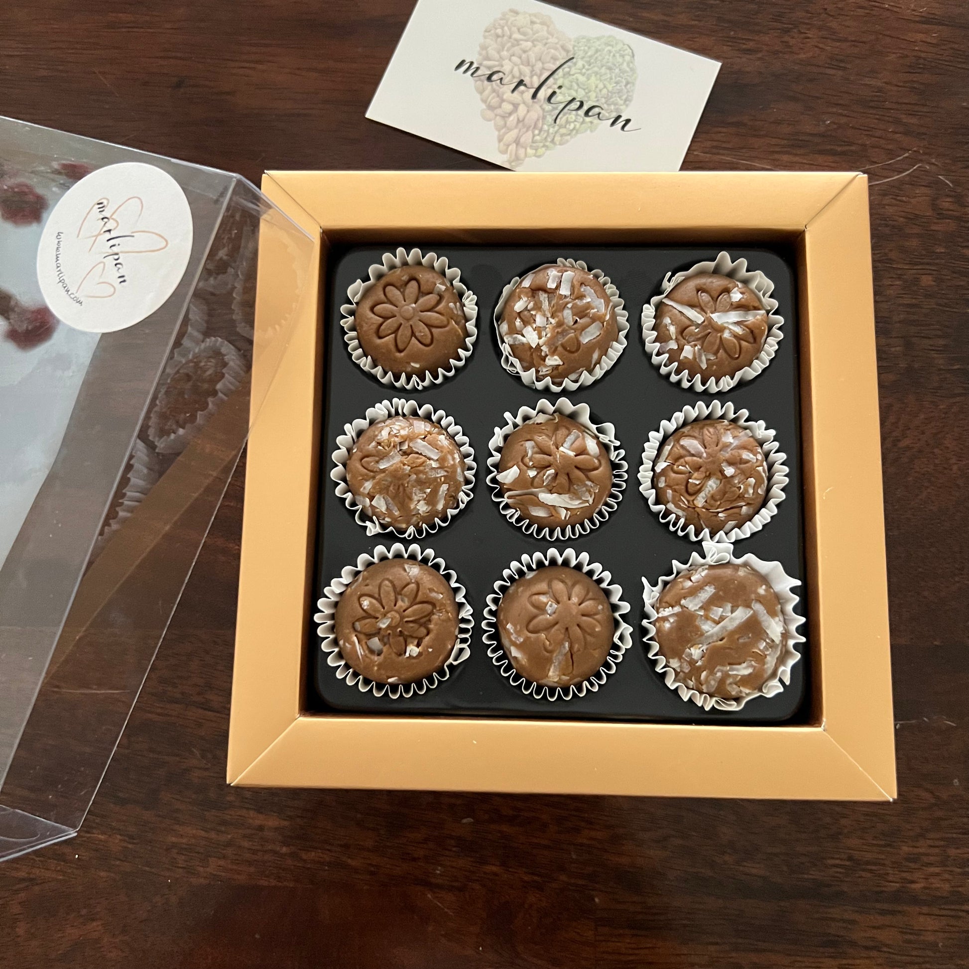 A more wholesome version of our signature handcrafted marzipan with organic shredded coconut, made with organic coconut sugar instead of white powder sugar, which has a much lower glycemic index. It gives a unique dusky brown color and a unique taste. The dough is made freshly upon order with premium almonds and orange blossom water.