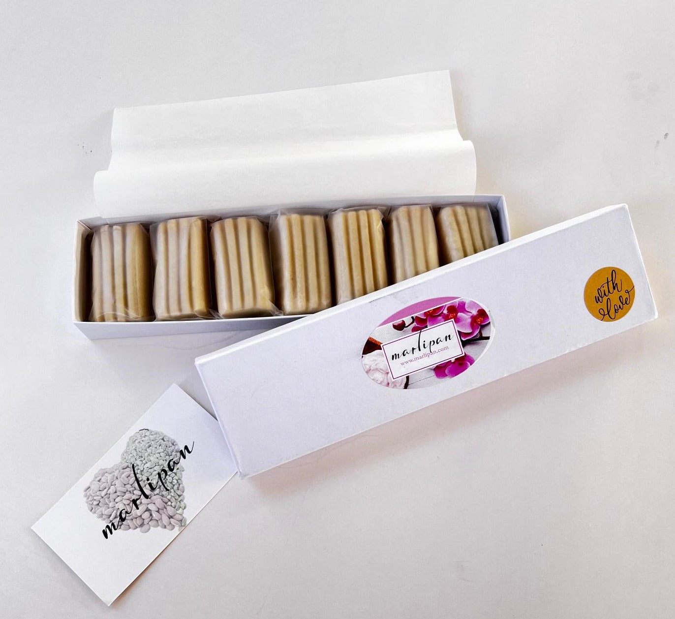 Experience the perfect harmony of flavors with our handcrafted pistachio-filled marzipan. Made with the finest premium almonds, delicately blended with orange blossom water and a touch of powdered sugar.
